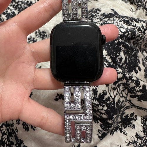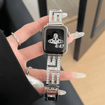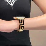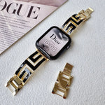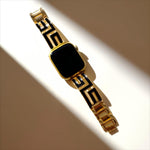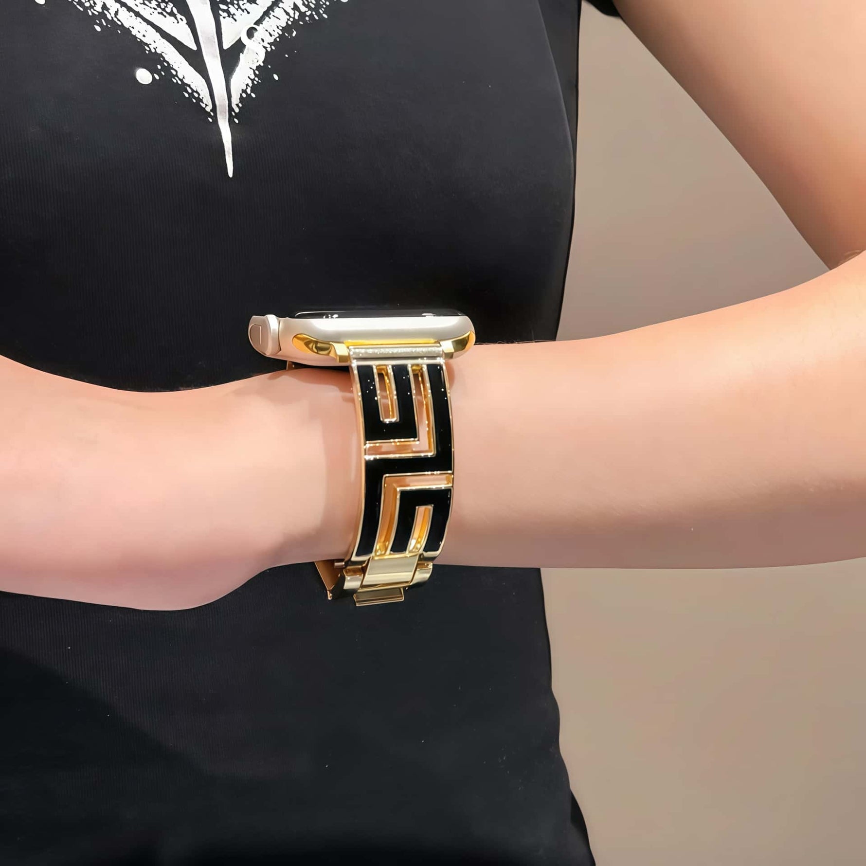 This luxury Apple Watch strap features a bold geometric link design inspired by modern jewelry, giving your smartwatch a fashionable edge.