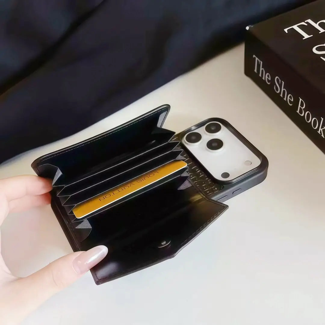 Crafted from premium textured leather, this elegant iPhone case features a built-in card holder, allowing you to carry your essential cards effortlessly—perfect for daily use, travel, or nights out.